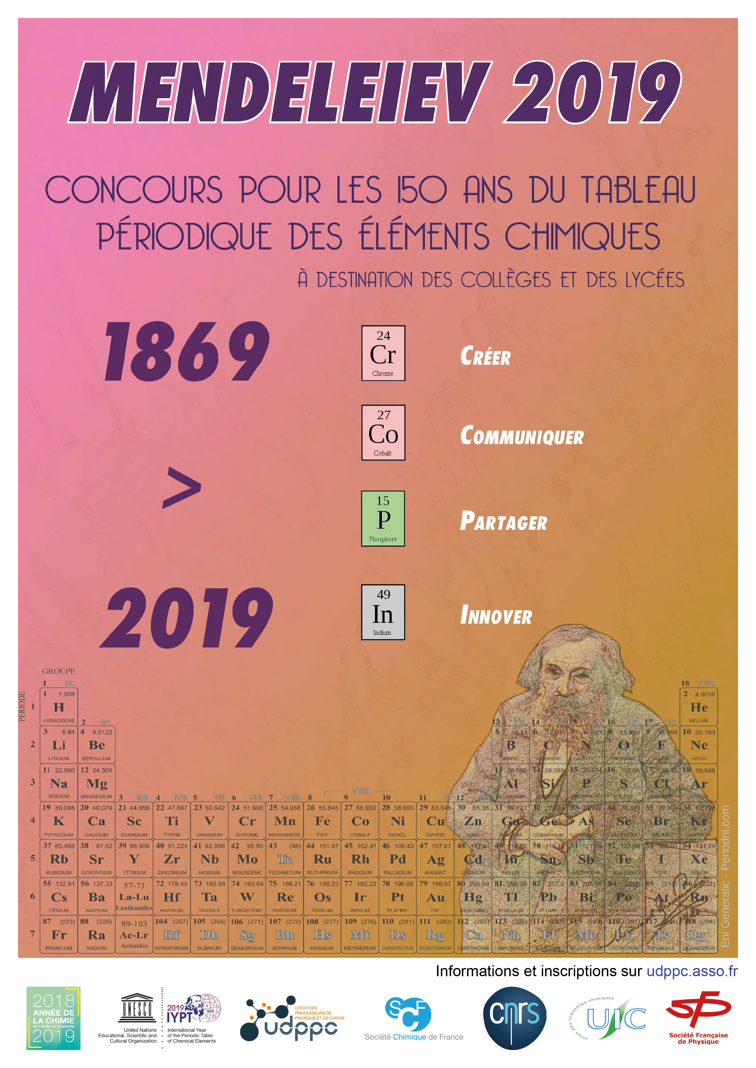 Dans le cadre de « l’année du tableau périodique des éléments chimiques » 2019 de l’UNESCO et de celle de la chimie 2018-2019 du Ministère, l’UdPPC organise un concours « Mendeleïev 2019 » dont l’objectif est la présentation d’une production sur le thème de la classification périodique.